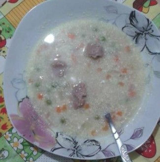 In a little oil, fry the chopped onion and meat chopped into cubes. Veal I used. Pour water, add finely chopped carrot, parsley, peas and potatoes and spices. The laurel and parsley give extra taste to this soup. When the meat is cooked to give half a teaspoon of vinegar and rice. At the end stir in a pot cream and one egg, pour the soup and leave a little bit to cook on low heat.